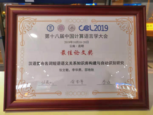 2019年10月18日—20日“第十八届中国计算语言学大会”(The Eighteenth China National Conference on Computational Linguistics, CCL 2019)在昆明理工大学举行。我中心邵艳秋教授团队的《汉语复合名词短语语义关系知识库构建与自动识别研究》(作者:张文敏,李华勇,邵艳秋)获得今年的最佳论文奖。作为中国中文信息学会(CIPS)的旗舰会议,CCL已成为国内自然语言处理领域权威性最高、规模和影响最大的学术会议(2018年注册参会超过1000人次)。